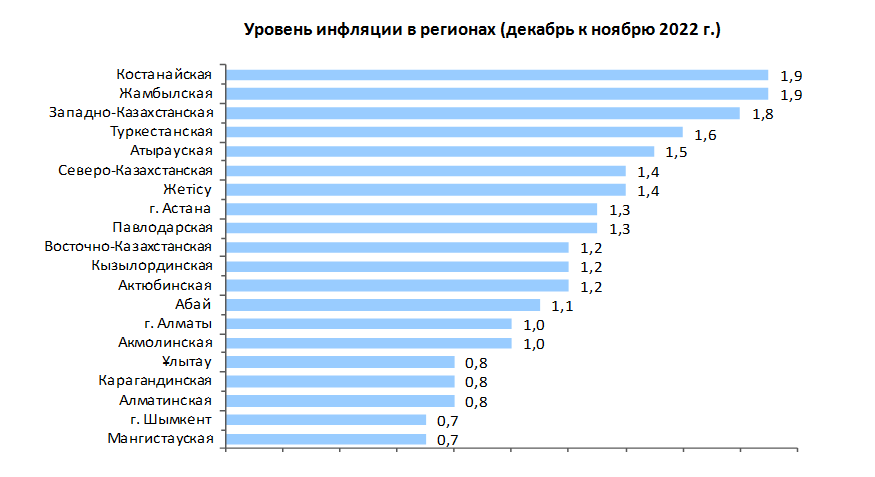 К слову, среди регионов самая высокая месячная инфляция зарегистрирована в Костанайской и Жамбылской областях – по 1,9% (выше среднереспубликанского уровня на 0,7 п.п), самая низкая – по 0,7% в г. Шымкент и Мангистауской области.
