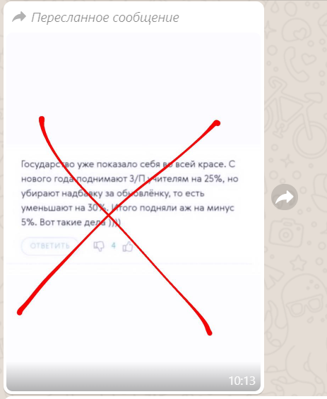 В Министерстве образования и науки опровергли информацию о том, что казахстанским педагогам сократят заработную плату в 2022 году. Недостоверное сообщение распространяли в мессенджере WhatsApp, передает BaigeNews.kz со ссылкой на Stopfake.kz.