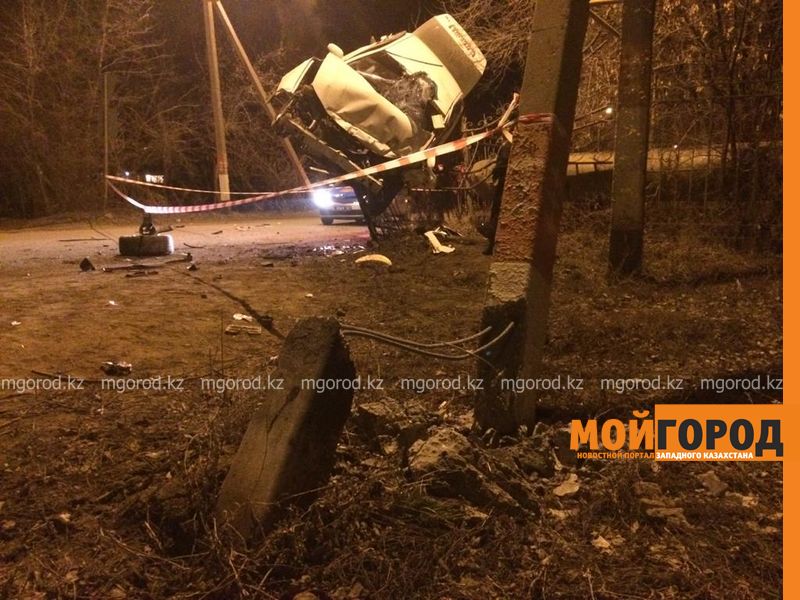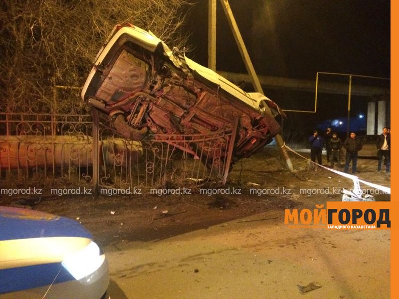 В Уральске автомобиль повис на ограждении после столкновения со столбом, передает