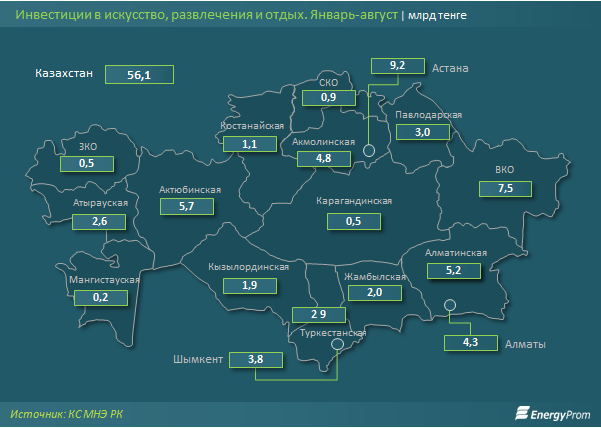 Из 56 млрд тенге инвестиций, направленных в искусство, развлечения и отдых за 8 месяцев, сразу более 9 млдр пришлось на Астану, сообщает Energyprom.