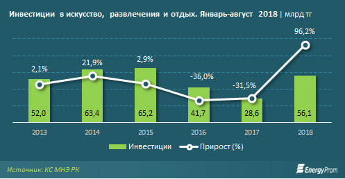 Последний раз инвестиции в сферу развлечений показывали рост в 2015 году. Тогда в соответствующем периоде (январь-август) они составили 65,2 млрд тенге.