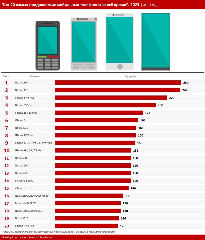 По данным Yahoo Finance, самый популярный мобильный телефон всех времён на 2023 год (без учёта моделей, выпущенных после 2021-го) — легендарная Nokia 1100, продажи которой в мире составили 250 млн ед. Второе место заняла ещё одна модель этого финского бренда — Nokia 1110: 248 млн ед. Замыкают тройку лидеров выпущенные в 2014 году Apple iPhone 6 / 6Plus, продажи которых составили 222 млн ед., в том числе за счёт большой популярности и перевыпуска в 2017-м на рынках Индии и Китая.