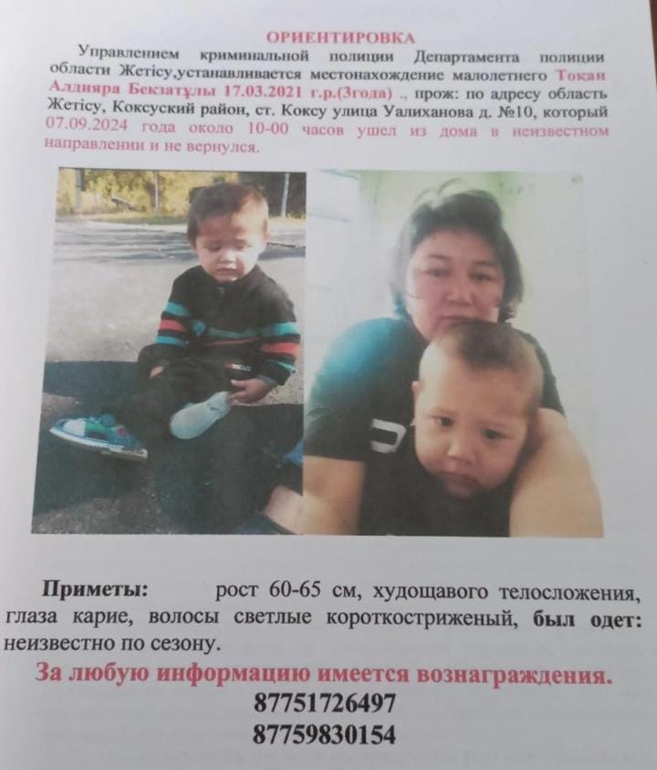 В посёлке Коксу области Жетысу 11-й день разыскивают трёхлетнего Алдияра Токана. Вместе с полицейскими и спасателями поиски малыша ведут волонтёры и сельчане. Родители Алдияра верят, что их сын жив и обещают вознаграждение за любую информацию о его местонахождении, передаёт корреспондент BaigeNews.kz.