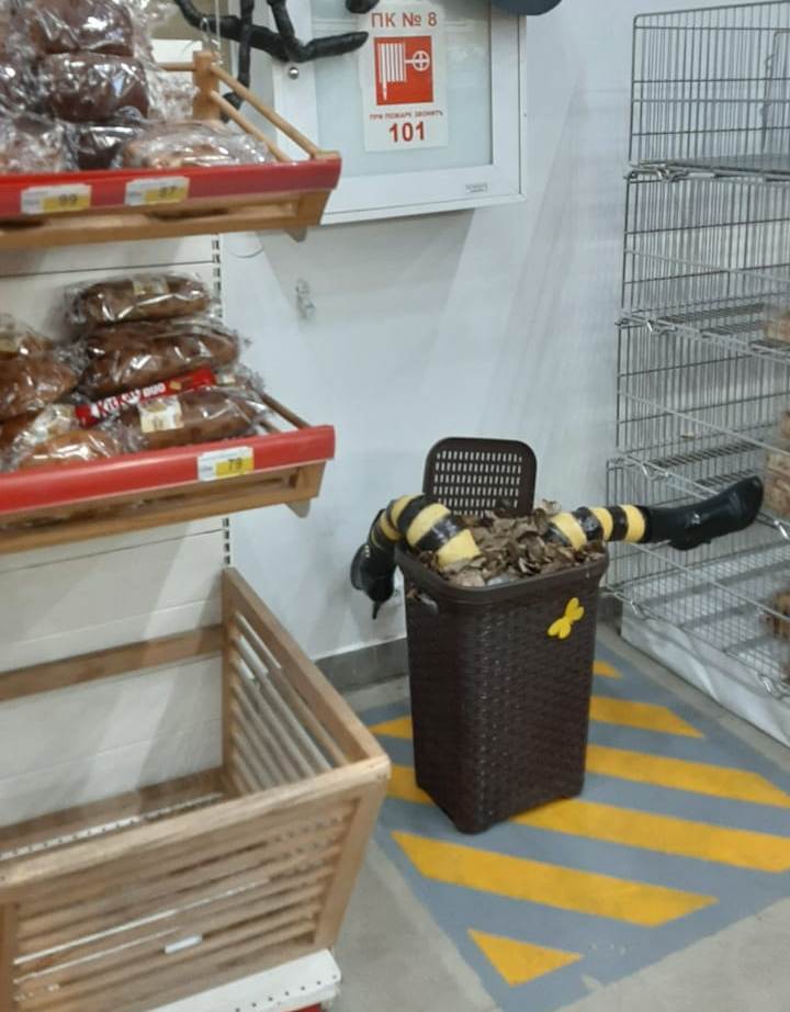 Также рядом с прилавками – мусорная корзина, из которой торчат отрубленные женские ноги в сапогах на каблуках.