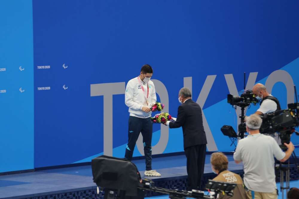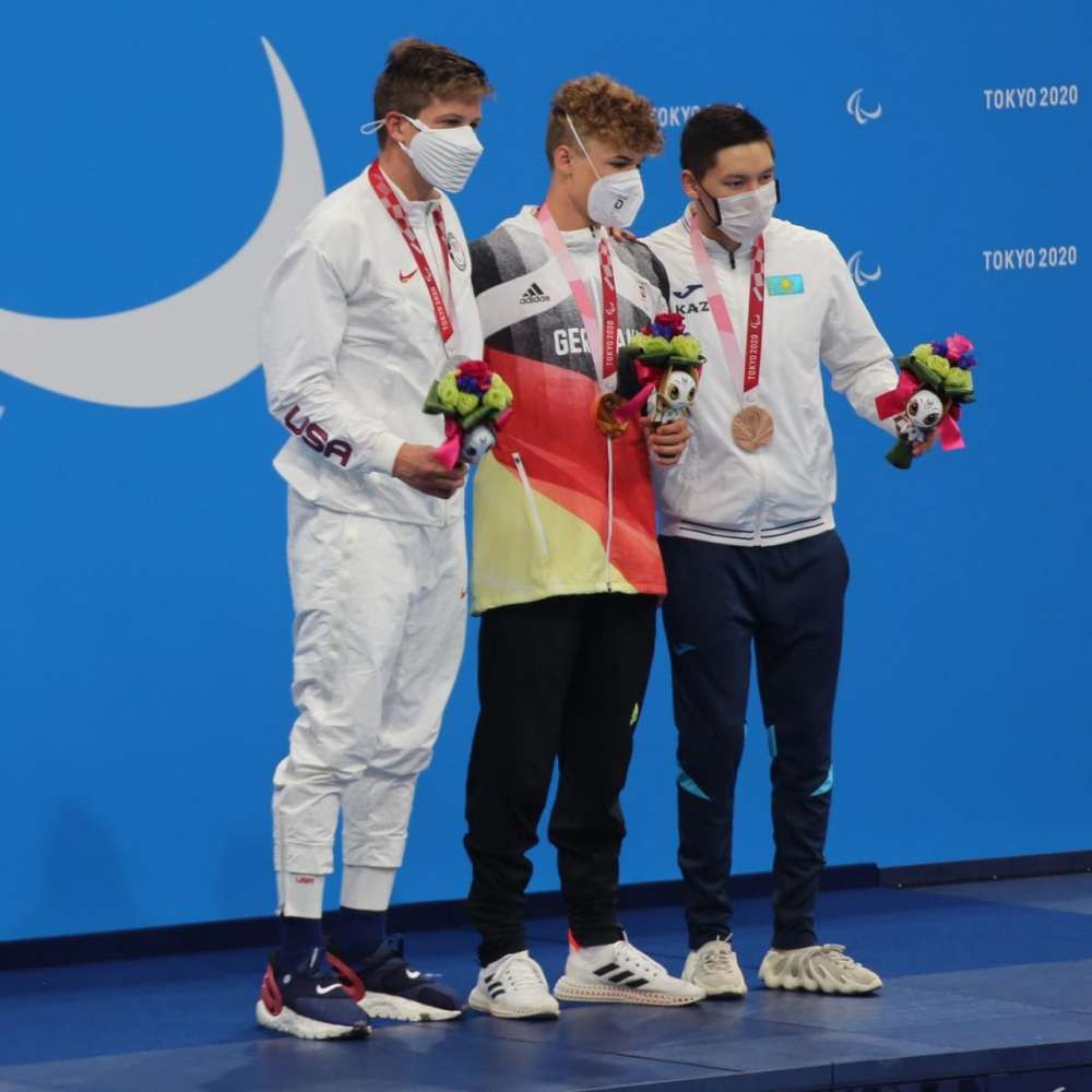 Пловец Нурдаулет Жумагали на церемонии награждения на Паралимпиаде в Токио. Все фото из личного архива спортсмена.