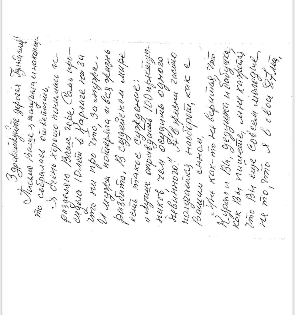 "Я очень понимаю ваше горе, сама просидела 10 лет в Карлаге ни за что, ни про что, – делится тоскливыми мыслями 87-летняя вдова. – И мужа потеряла, и вся жизнь разбита. В судейском мире есть такое суждение: "Лучше оправдать 100 преступников, чем осудить одного невинного". А в жизни часто получается наоборот, как с Вашим сыном…"