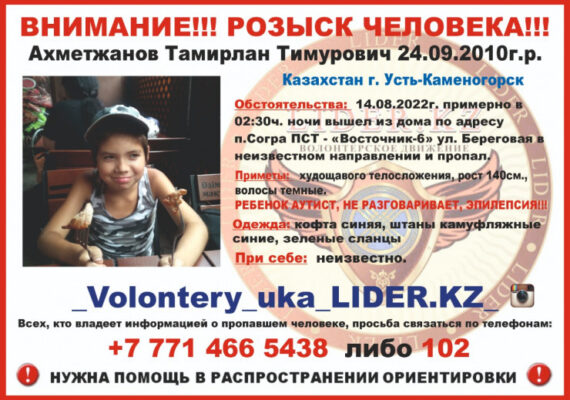 Накануне в Усть-Каменогорске нашли 12-летнего Тамирлана Ахметжанова, которого жители города искали почти двое суток. К счастью, мальчика нашли живым и здоровым. Поиск осложнялся тем, что у ребенка диагноз "аутизм", передаёт BaigeNews.kz. Известно, что Тамирлан ушёл из дома посреди ночи, пока его мама спала.