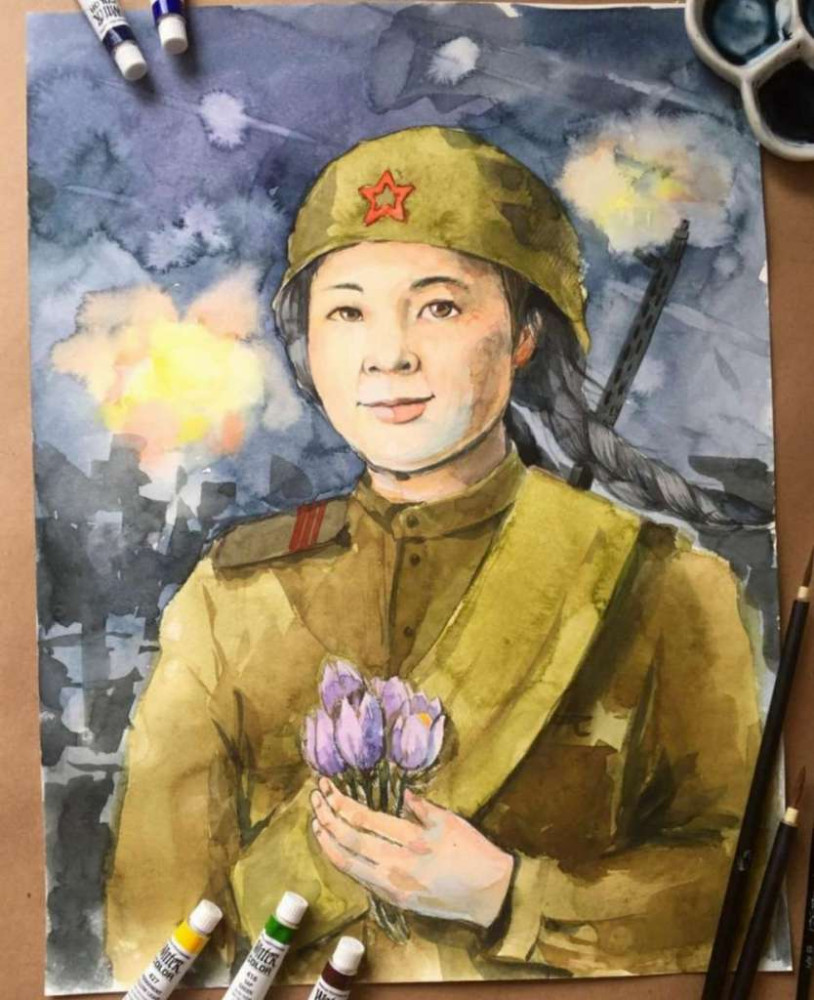 Молодая художница создала незабываемый портрет казахской пулеметчицы Маншук Маметовой на фоне войны.