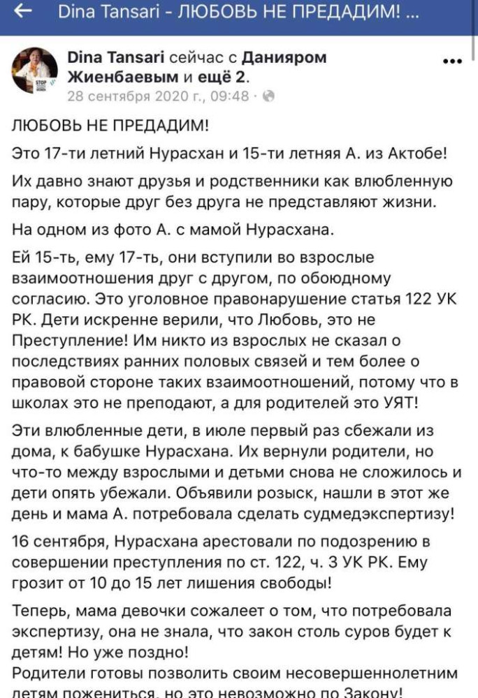 "Ей 15, ему 17, они вступили во взрослые взаимоотношения друг с другом, по обоюдному согласию. Это уголовное правонарушение статья 122 УК РК. Дети искренне верили, что Любовь это не Преступление! Им никто из взрослых не сказал о последствиях ранних половых связей и тем более о правовой стороне таких взаимоотношений, потому что в школах это не преподают, а для родителей это УЯТ!", - рассказала Дина Тансари.