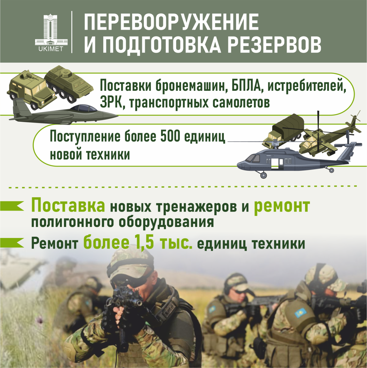 Продолжается развитие учебно-материальной базы. До конца года планируется поставка тренажеров и ремонт полигонного оборудования, что позволит сэкономить до 300 млн тенге в год. Также проводится работа по ремонту военной техники.