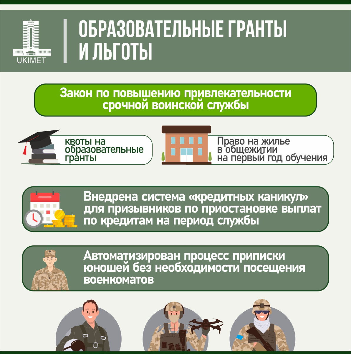 Министерство обороны Казахстана инициировало ряд мер для повышения привлекательности срочной воинской службы. В мае был принят Закон, закрепляющий квоты на образовательные гранты для военнослужащих. Государственные гранты на бесплатное обучение будут предоставляться тем, кто во время службы достиг высоких результатов в боевой и государственно-правовой подготовке. Дополнительным преимуществом станет приоритетное право на получение жилья в общежитии на первый год обучения в вузе.