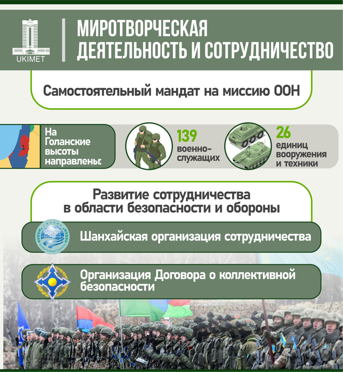 В течение последних 5 лет Казахстан активизировал международную и миротворческую деятельность. Наша страна единственная из стран СНГ, которая получила самостоятельный мандат на миссию Организации объединенных наций. В марте 2024 года впервые казахстанский контингент был направлен на Голанские высоты для участия в миссиях ООН, включая 139 военнослужащих и 26 единиц вооружения и техники.