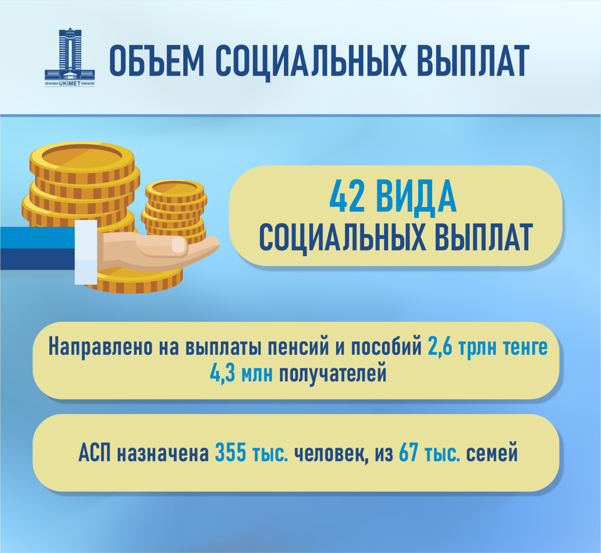 За счет средств республиканского бюджета выплачивается 42 вида социальных выплат, включая базовую и солидарную пенсии. За 6 месяцев текущего года на выплату пенсий и пособий было направлено 2,6 трлн тенге для 4,3 млн человек, в том числе для 2,4 млн пенсионеров и 1,9 млн получателей государственных пособий. По состоянию на 1 июля 2024 года адресная социальная помощь назначена более 355 тыс. человек из 67 тыс. семей, оказавшихся в сложной жизненной ситуации.