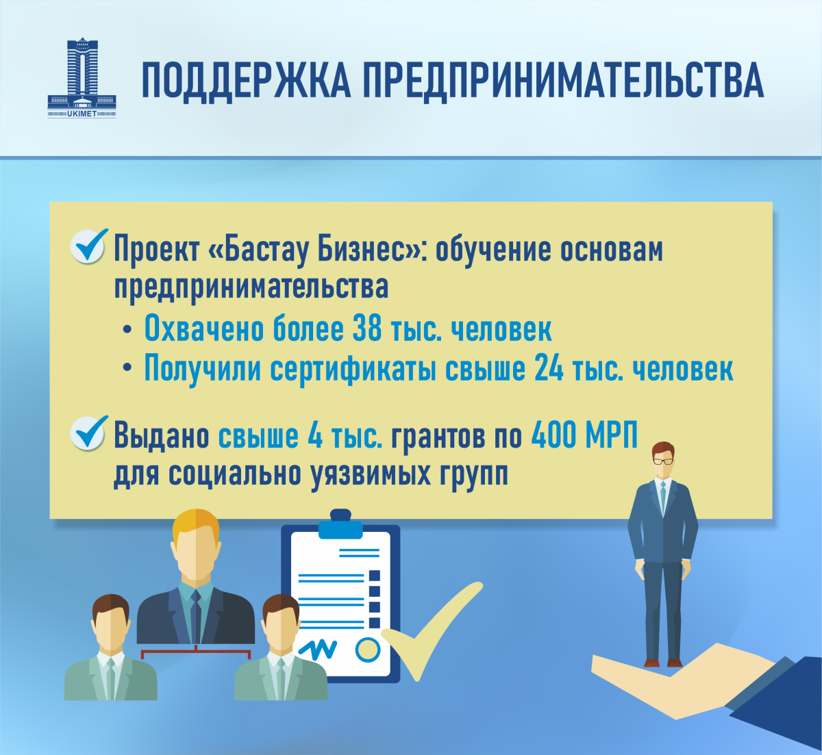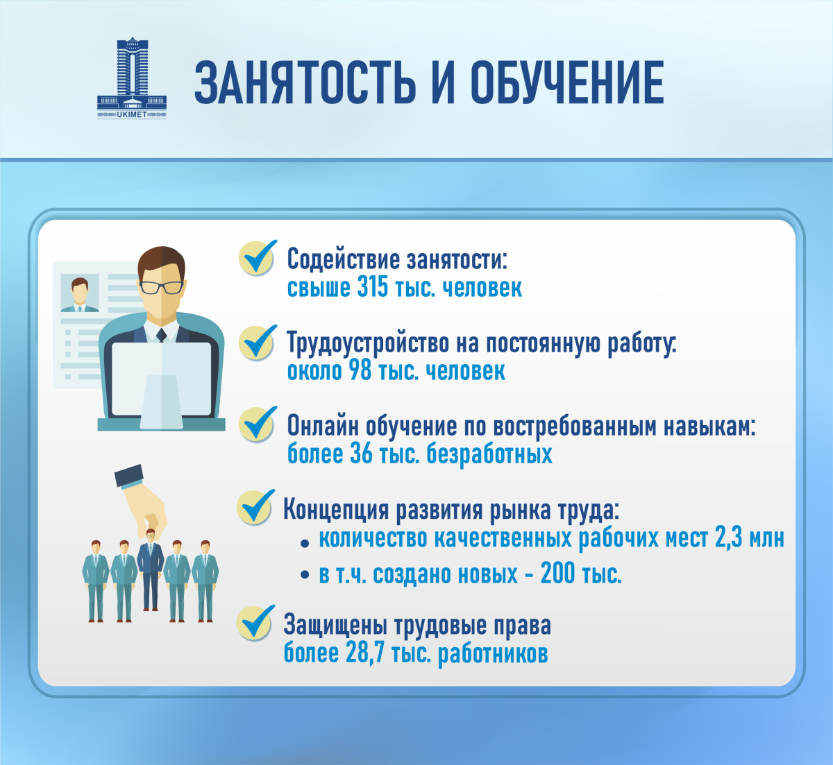 Активными мерами содействия занятости охвачено свыше 315 тыс. казахстанцев. Трудоустроены порядка 231 тыс. человек, из них почти 98 тыс. – на постоянную работу. Онлайн обучением по востребованным навыкам на рынке труда охвачено более 36 тыс. безработных, из них почти 33 тыс. завершили обучение. В рамках проекта "Бастау Бизнес" более 38 тыс. человек охвачены обучением основам предпринимательства, завершили и получили сертификаты свыше 24 тыс. Более 110 тыс. казахстанцев прошли социальную профориентацию по выбору сферы деятельности. Кроме того, для реализации новых бизнес-инициатив гражданам, относящимся к социально уязвимым категориям населения, выдано свыше 4 тыс. грантов в размере 400 МРП.