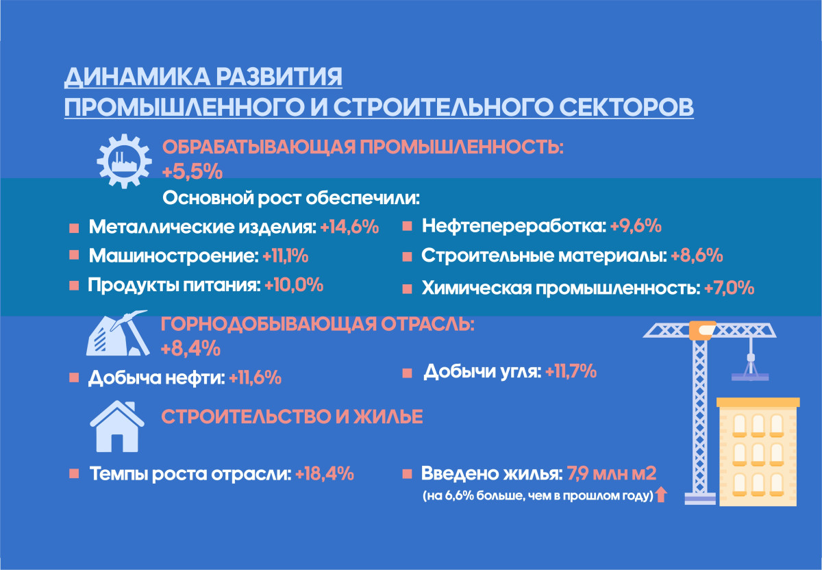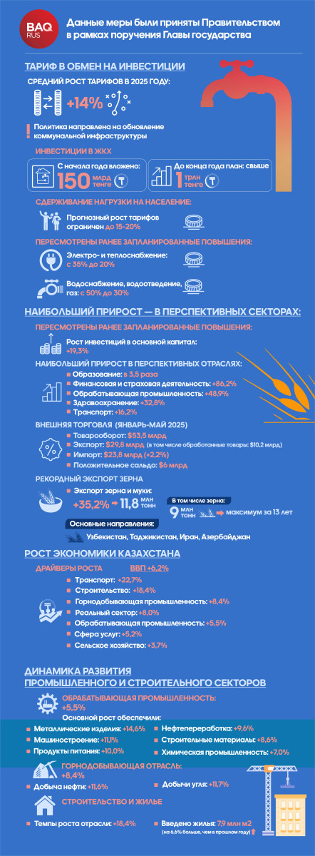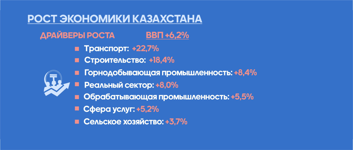 По информации министра национальной экономики Серика Жумангарина, по итогам шести месяцев текущего года рост ВВП составил 6,2%. Основными драйверами остаются реальный сектор, транспорт, строительство и торговля. Активный рост наблюдается также в обрабатывающей промышленности и сельском хозяйстве.