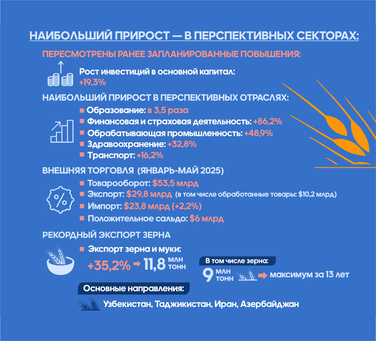 Положительная динамика наблюдается в сфере привлечения инвестиций. За полугодие рост инвестиций в основной капитал составил почти 20%. Существенные вложения зафиксированы в образовании, финансовой деятельности, промышленности, транспорте и здравоохранении. С начала года 134 инвестора уже воспользовались механизмом Fast Track. Общий план по привлечению ПИИ в 2025 году составляет $25 млрд.
