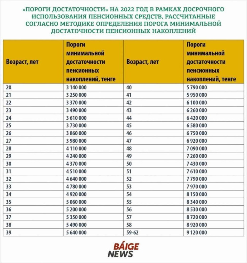 Однако в декабре стало известно, что с 2022 года в силу вступают новые поправки. Причем информацию никто не анонсировал и не обсуждал, ЕНПФ просто опубликовал новые пороги на своем сайте. Если сравнивать цифры 2022 года с 2021 годом, то становится понятно, что "пороги достаточности" вырастут почти в два раза. Например, 20-летние граждане в 2021 году должны были иметь на счету 1 710 000 тенге, а 40-летние – 3 420 000. В 2022 году цифры составят 3 140 000 тенге и 5 790 000 тенге соответственно. По оценке ЕНПФ, изъять пенсионные накопления в 2022 году смогут 582 тысячи казахстанцев. По данным Минтруда, эта цифра составляет 180 тысяч человек.