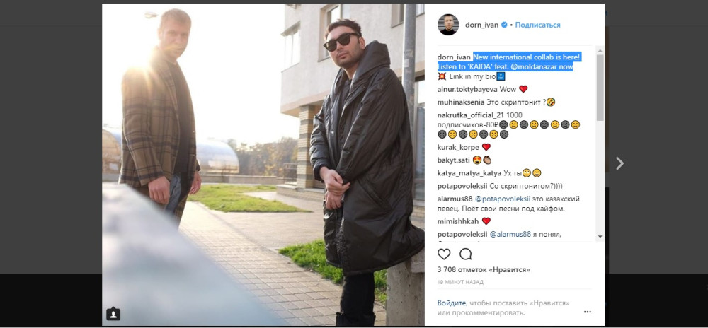 Казахстанский исполнитель Галымжан Молданазар записал совместный трек с Иваном Дорном, об этом на своей странице в instagram сообщил украинский певец.