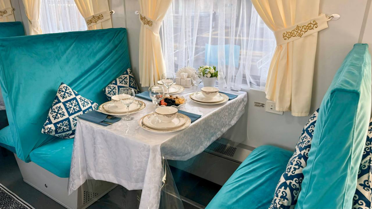 Поезд снаружи украшен изображением государственного флага, а внутри используется постельное бельё в золотых тонах с национальными орнаментами, создающими уникальную атмосферу. Вагон-ресторан оформлен в традиционном стиле и предлагает меню с блюдами национальной и европейской кухни.
