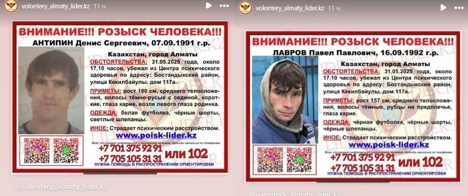 В Алматы из Центра психического здоровья 31 мая в вечернее время сбежали два пациента. Как сообщили волонтеры, оба мужчины страдают психическими расстройствами и нуждаются в постоянном медицинском наблюдении, передает BAQ.KZ.