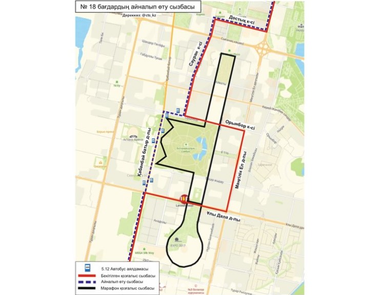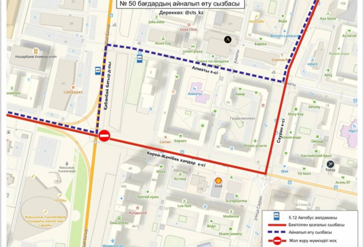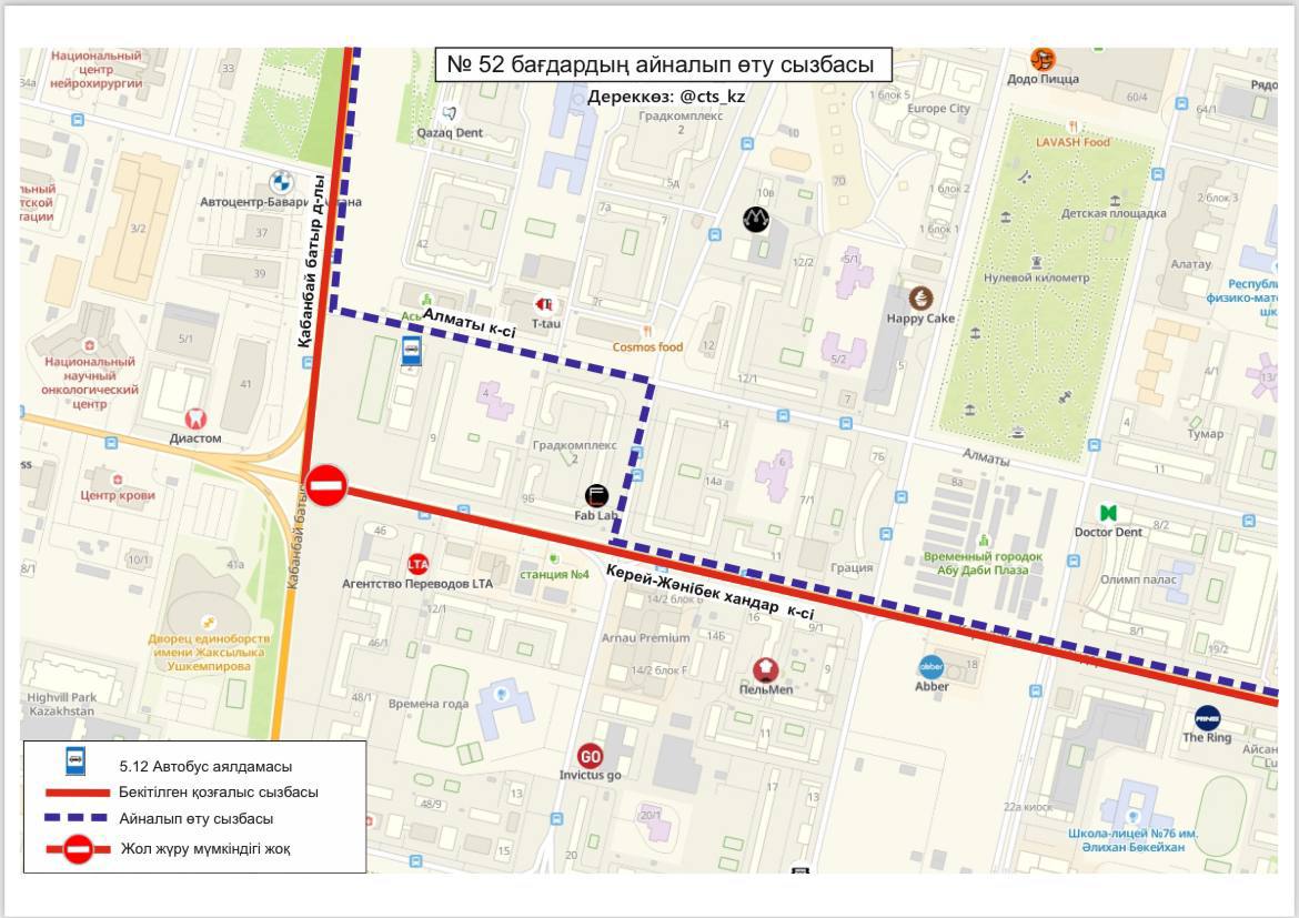 "В связи с выполнением работ по демонтажу металлических конструкций LRT ограничено движение по улице Керей Жанибек хандар на участке от проспекта Кабанбай батыра до улицы Сауран. В связи с чем временно изменена схема движения маршрута № 52. С измененной схемой движения можете ознакомиться на картинке", — говорится в сообщении.