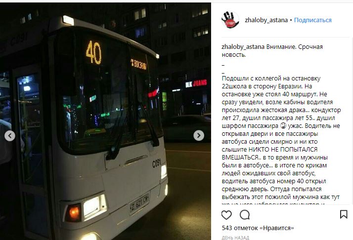 «Кондуктор лет 27 душил пассажира лет 55. Душил шарфом пассажира. Ужас. Водитель не открывал двери, и все пассажиры автобуса сидели смирно и никто, слышите, НИКТО НЕ ПОПЫТАЛСЯ ВМЕШАТЬСЯ…в то время и мужчины были в автобусе... в итоге по крикам людей ожидавших свой автобус, водитель автобуса номер 40 открыл среднюю дверь. Оттуда попытался выбежать этот пожилой мужчина, как тут же на него набросился кондуктор и продолжал избивать и душить шарфом… пытались их разнять очевидцы, но кондуктор не отпускал этого мужчину, в драку ввязались очевидцы и пытались прекратить этот ужас», - рассказывает пользователь. (орфография и пунктуация в основном сохранены – прим. ред.)