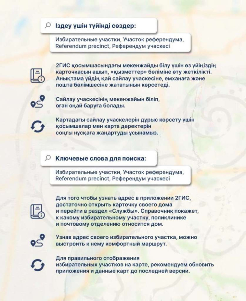 Для удобства жителей города в картах приложений появилась возможность определения локации собственного участка. Ключевые слова для поиска: "Референдум учаскесі", "Избирательные участки", "Участок референдума", "Referendum precinct".