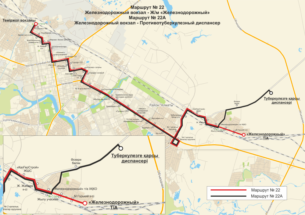 Схема движения маршрута № 22а: от начального пункта «Железнодорожный вокзал» до остановки «ТОО «КазГерСтрой» без изменений, далее – ул. Ж. Жабаева – ул. Екибастуз – шоссе в направлении села Еркіншілік – подъездная дорога к Противотуберкулезному диспансеру – конечная остановка «Противотуберкулезный диспансер города Астаны».