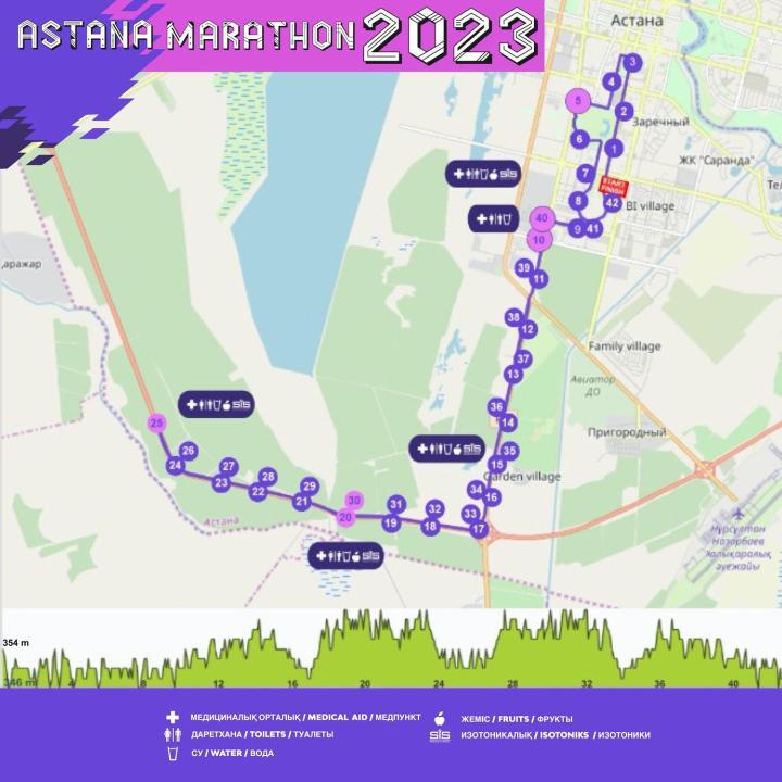 Старт с территории МВЦ "EXPO", пр.Мангилик Ел, 53/1 на улицу Туркестан – поворот налево перед ТРЦ Абу Даби Плаза по границе Линейного парка – Акмешит – Орынбор и далее, не добегая до пр. Кабанбай батыра, поворот налево по беговой дорожке в Ботаническом саду до ул. Акмешит – Акмешит – вокруг Экспо-городка – Туркестан – и финиш на территории МВЦ "EXPO".