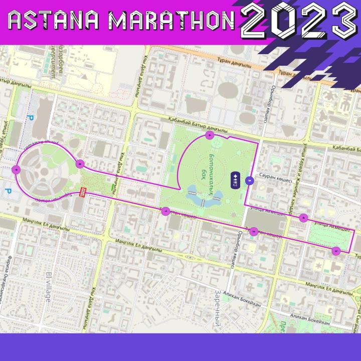 Старт с территории МВЦ "EXPO", пр.Мангилик Ел, 53/1 на улицу Туркестан – поворот налево перед ТРЦ Абу Даби Плаза по границе Линейного парка – Акмешит – Орынбор и далее, не добегая до пр. Кабанбай батыра, поворот налево по беговой дорожке в Ботаническом саду до ул. Акмешит – Акмешит – вокруг Экспо-городка – Рыскулова – Кабанбай батыра – шоссе Каркаралы – направо на Объездную улицу – далее разворот – Объездная – шоссе Каркаралы – Кабанбай батыра – Рыскулова – Акмешит – направо вокруг Экспо-городка – Туркестан – и финиш на территории МВЦ "EXPO".