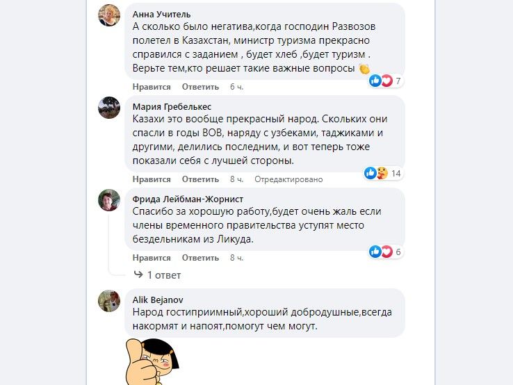 "После ряда встреч, проведенных здесь, в Казахстане, с представителями правительства мне удалось достичь договоренностей по разработке соглашения о ввозе пшеницы в Израиль. В последние месяцы глобальный кризис нехватки зерна коснулся и Израиля. Пытаясь найти решение этой проблемы, я прилетел во главе правительственной делегации в Казахстан — один из крупнейших экспортеров пшеницы в мире. Благодаря соглашению об импорте пшеницы из этой страны в Израиль мы сможем снизить цены на муку и хлебобулочные изделия, обеспечив продовольственную безопасность на годы вперед. Также была достигнута договорённость о начале прямого авиасообщения между Израилем и Казахстаном. В рамках межправительственной комиссии были подписаны соглашения в сфере сельского хозяйства, здравоохранения, науки и образования. Я очень благодарен ...профессиональной межведомственной комиссии и нашим казахским партнерам за сотрудничество", — написал лично Развозов в своем facebook-аккаунте.