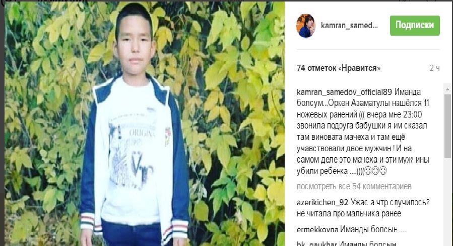 «…Оркен Азаматулы нашелся, 11 ножевых ранений. Вчера мне в 23:00 звонила подруга бабушки, я им сказал там виновата мачеха и там еще участвовали двое мужчин! И на самом деле это мачеха и эти мужчины убили ребенка…», - написал на своей странице экстрасенс.
