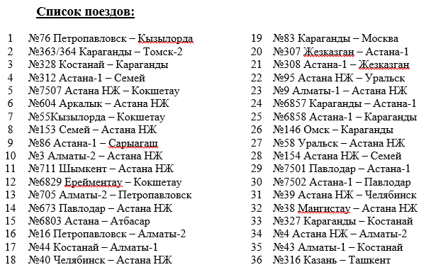 В этой связи ожидается корректировка расписания от одного до двух часов и порядка курсирования 36 пассажирских и пригородных поездов по узлу Астана.