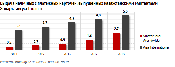 В последние два года самой активной системой, ставшей драйвером карточного рынка, является MasterCard, с годовым ростом объёма снятий наличности сразу на 70,7%, до 2,7 трлн тенге за январь–август текущего года. Год назад рост в аналогичном периоде составил 66,5%.
