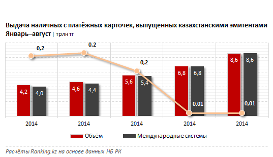 Объём выдачи наличных с платёжных карточек, выпущенных казахстанскими эмитентами на территории РК, за январь–август 2018 года составил 8,6 трлн тенге, говорится в исследовании Ranking.kz.