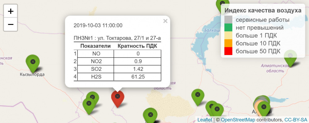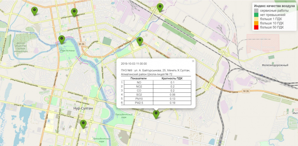 Карта слежения за атмосферой обновляется каждый час. Наблюдения за состоянием атмосферного воздуха на территории РК ведутся в 45 населенных пунктах на 140 постах, в том числе: на 56 постах ручного отбора проб (4 раза в сутки, в связи с тем, что анализы проводятся в лаборатории, данные поступают на следующие сутки); на 84 автоматических станциях (данные за каждый час). Предоставляется информация по качеству атмосферного воздуха, поступающая с мобильного приложения "AirKZ", где отражены фактические данные о концентрациях основных загрязняющих веществ в атмосферном воздухе: пыль, РМ 10, РМ 2,5, диоксид и оксид азота, оксид углерода, диоксид серы в зависимости от комплектации поста. По каждому посту открывается "легенда", где указаны фактические концентрации по каждому показателю, а также кратность превышения ПДК (предельно допустимые концентрации).