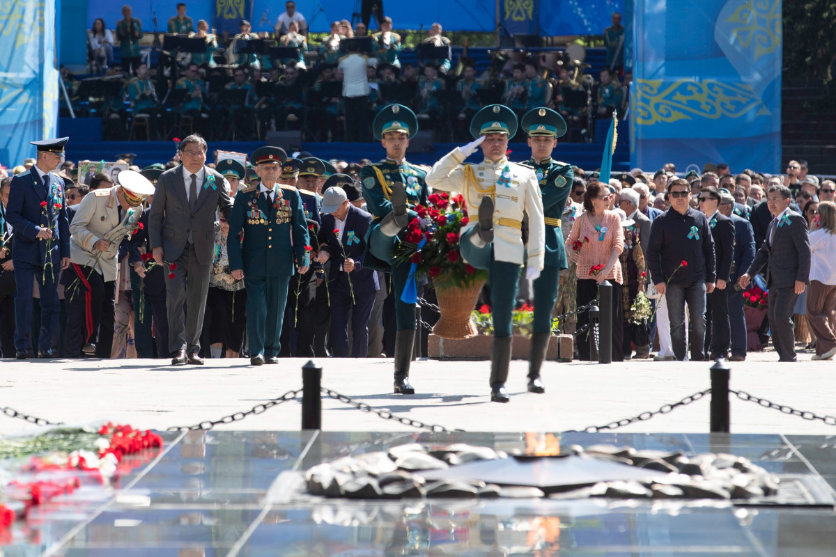 После минуты молчания цветы к Мемориалу Славы в память о погибших воинах-казахстанцах возложили ветераны Великой Отечественной войны, труженики тыла, военнослужащие, представители правоохранительных органов, общественные деятели и жители города.