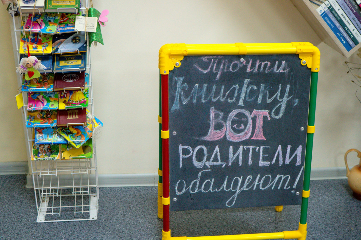 На библиотечном диване давно поселился большой игрушечный тигр, которого порываются обнять первоклашки. Тигр остался с акции по сбору книг для РЦПД.