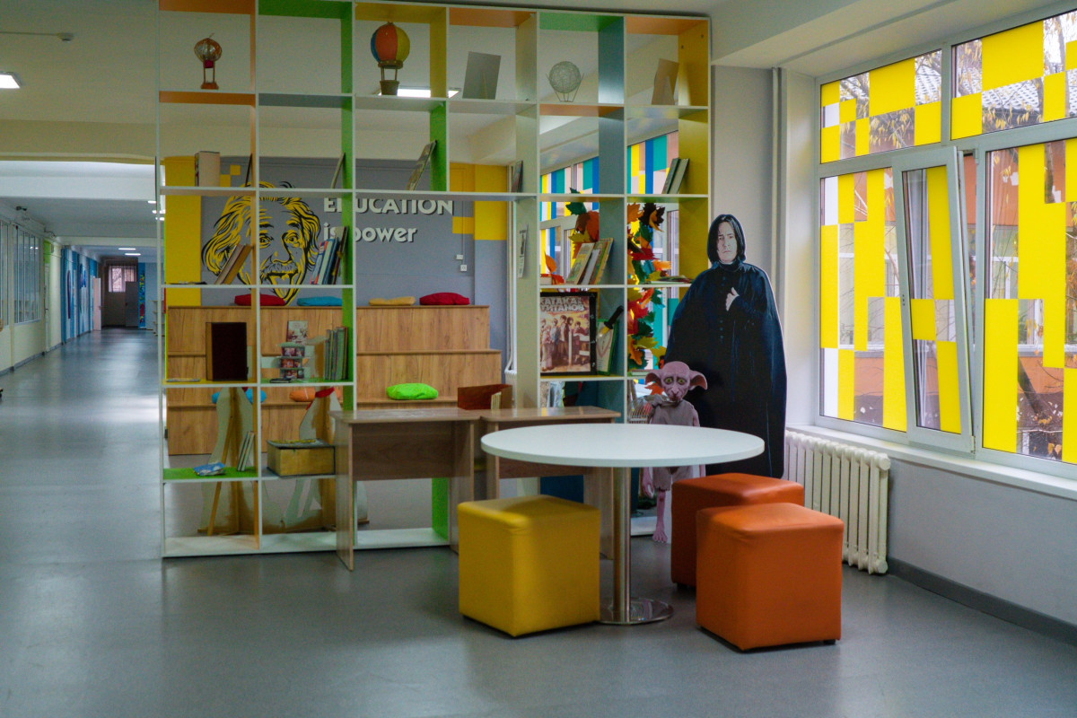 Два года назад в школе запустили акцию "Любимая книга", к которой подключились родители. Детям разрешили творить, и на стеллажах в коридоре появились самодельные книги. Здесь же поселились картонные фигуры Северуса Снейпа, Добби и двух далматинцев. Целая фотозона.
