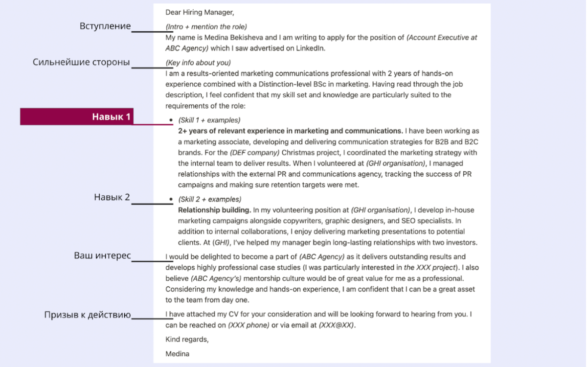 Структура сопроводительного письма: вступление, которое сразу же показывает вас как отличного кандидата на роль, затем два или три важных навыка с примерами и призыв к действию (написать вам, позвонить или пригласить на собеседование). Важно также показать ваш интерес к компании хотя бы в нескольких предложениях.