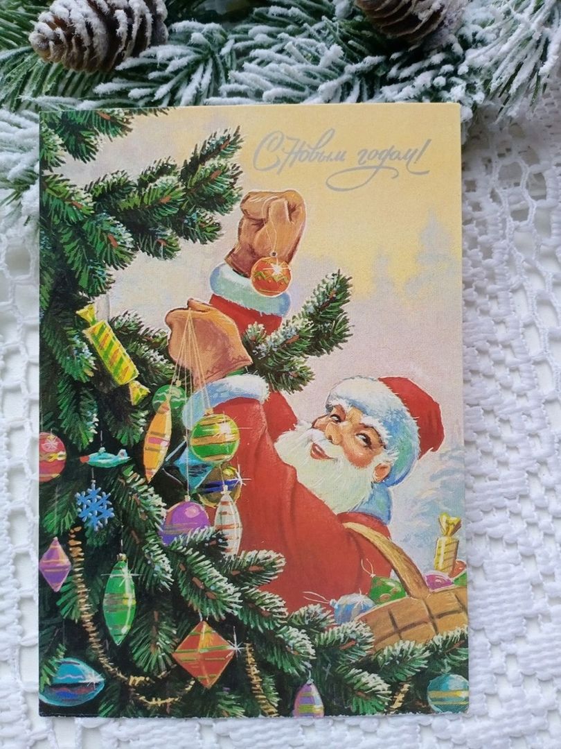 О появлении первых советских открыток бытуют две версии. По одним источникам, они были изданы ограниченным тиражом к новому, 1942 году. Другие утверждают, что партийное руководство страны решило наладить массовый выпуск идеологически соответствующих открыток ближе к 50-м годам. На большинстве из них стали изображать кремлёвские башни, Деда Мороза, Снегурочку и надпись "С Новым годом!".