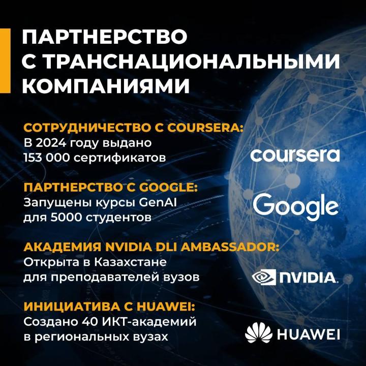Подписаны Меморандумы с Coursera, Google, Nvidia, "Huawei Technologies Kazakhstan" LLP, 01 Edu System, Binance Kazakhstan.