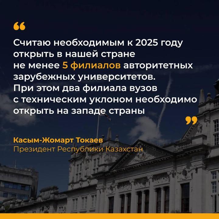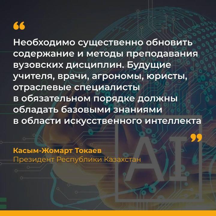 "Необходимо существенно обновить содержание и методы преподавания вузовских дисциплин. Будущие учителя, врачи, агрономы, юристы, отраслевые специалисты в обязательном порядке должны обладать базовыми знаниями в области искусственного интеллекта", – Касым-Жомарт Токаев.