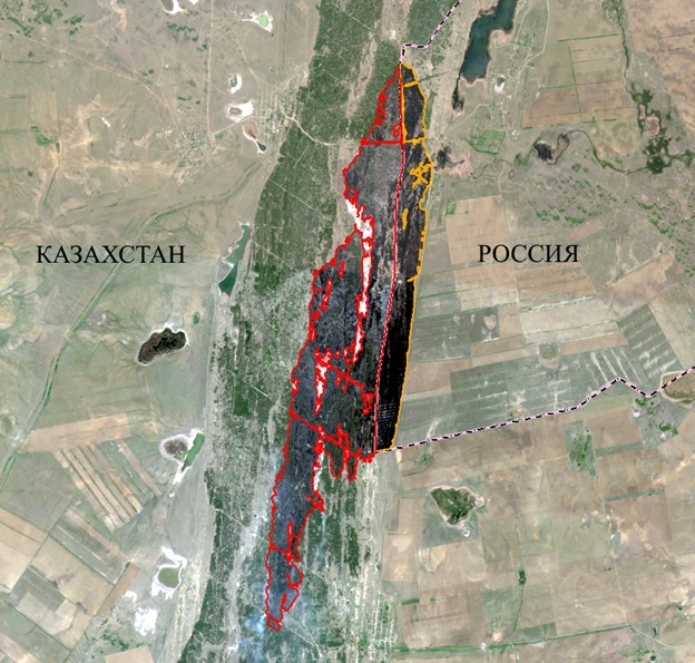 Космический cнимок за 24 мая 11:28 по времени Астаны с дешифрированным выгоревшим участком.
