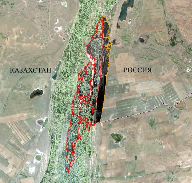 Космический cнимок за 24 мая 11:28 по времени Астаны с дешифрированным выгоревшим участком и территорией ГЛФ “Семей Орманы”.
