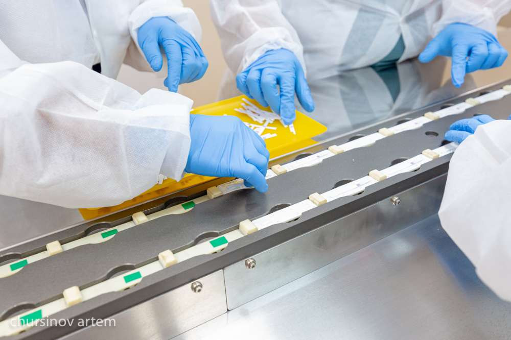 В сборочном цехе трудятся шесть человек. В день они могут собрать до 14 тысяч тестов. В основном их закупают крупные частные компании для проверки своих сотрудников.