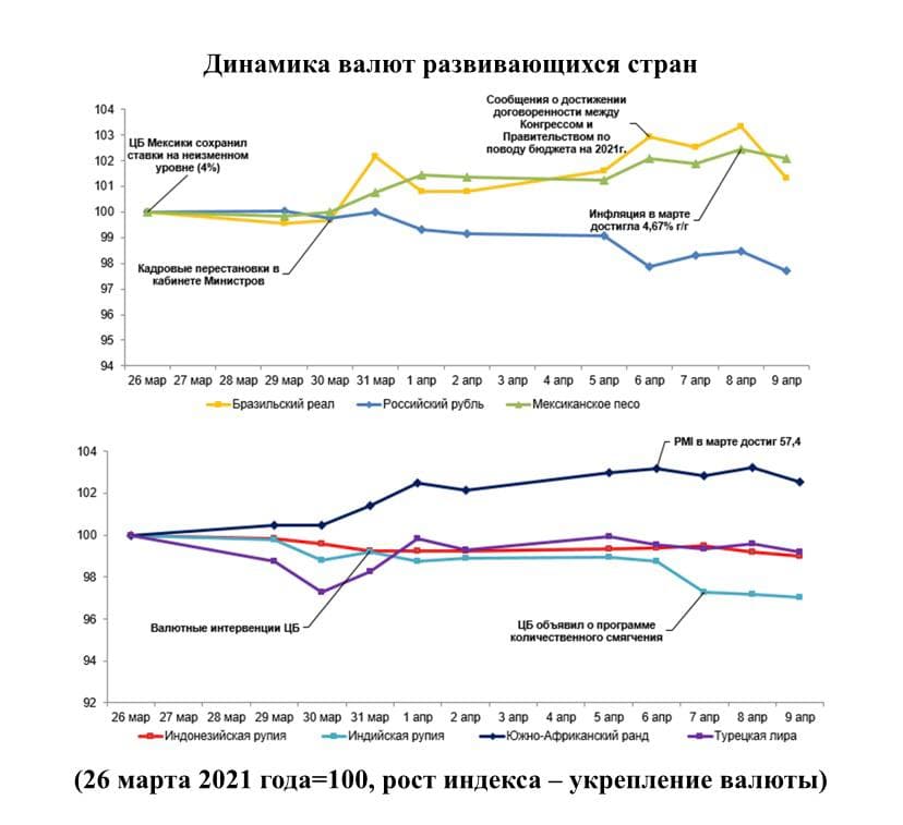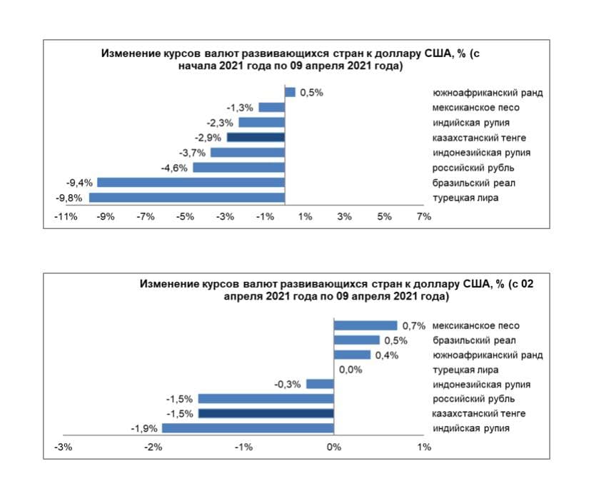 "На внешнем валютном рынке в период со 2 по 9 апреля 2021 года динамика валют развивающихся стран была разнонаправленной. МВФ скорректировал прогноз роста мировой экономики на 2021 года повысив его до 6 процентов (ранее прогноз был 5,5 процента). Глава ФРС США пообещал восстановить экономику США, просигнализировав, что восстановление не завершено. Цены производителей в КНР выросли на 4,4 процента г/г в марте, максимальным темпом с июля 2018 года, в США на 4,2 процента г/г, превысив ожидания аналитиков", - сообщили в Нацбанке.
