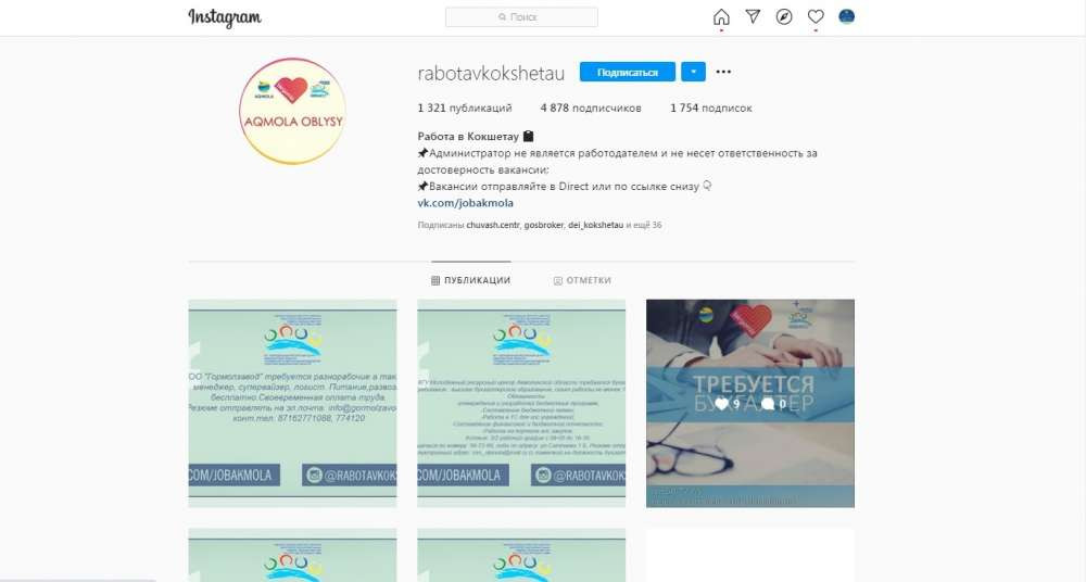 С этой целью в популярных социальных сетях "ВКонтакте" и Instagram созданы аккаунты "Работа в Кокшетау (Акмолинская область)", @rabotavkokshetau, призванные информировать молодых людей о свободных вакансиях.