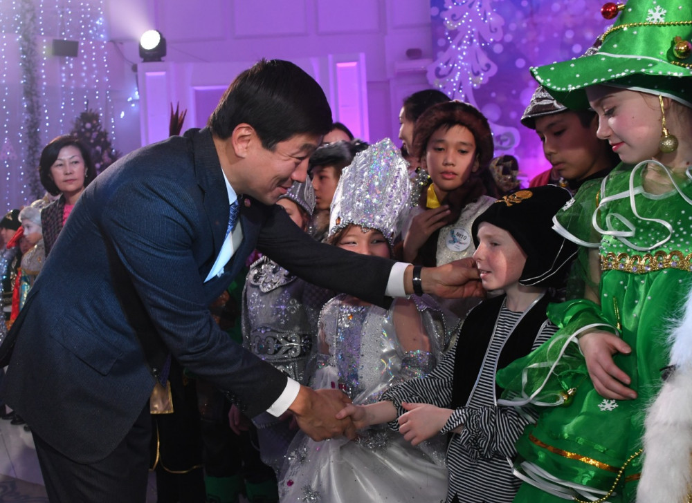 После зажжения ёлки и показа видеопоздравления Президента страны Нурсултана Назарбаева аким области Бердыбек Сапарбаев вручил каждому ребёнку подарок от имени Главы государства.