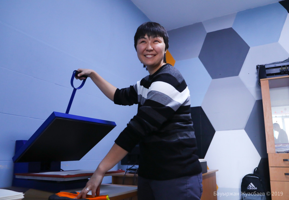 Для всех посетителей мастерской Эмин старается проводить экскурсию. Здесь есть небольшая полиграфия, в которой чуть более полугода работает Диана, она не слишком хорошо слышит. Девушка пришла сюда на позицию водителя, однако Эмин посоветовал ей попробовать потрудиться в полиграфии, Диана втянулась и ей всё нравится. "Всех сотрудников стараюсь вовлекать в обучение, чтобы они постоянно росли, развивались", - подчеркивает Эмин.